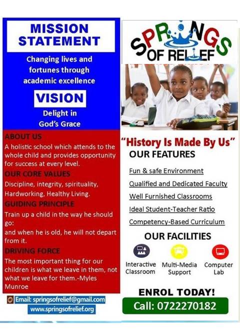 • Springs of Relief Academy (SoR), is a unique school that offers CBC national curriculum. We are here to train children spiritually, mentally, physically, and emotionally.